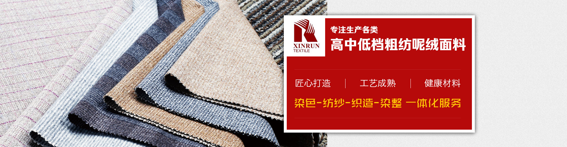 主要產品有:法蘭絨、麥爾登,立絨,順毛,兔羊絨,阿爾帕卡,雙面呢,格呢,斜紋呢、圈圈呢、針織毛呢,臺球呢和地毯等幾百個品種以及上千個花色,另外新開發(fā)特種花式紗面料、復合,印花,扎染,涂層,貼膜,防水,防靜電等各類功能型面料。